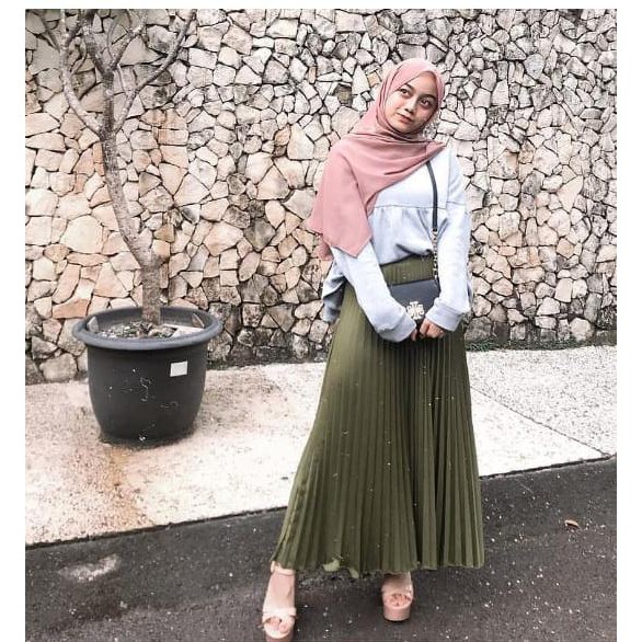 Ootd hijab remaja kekinian menggunakan rok plisket 2021.
